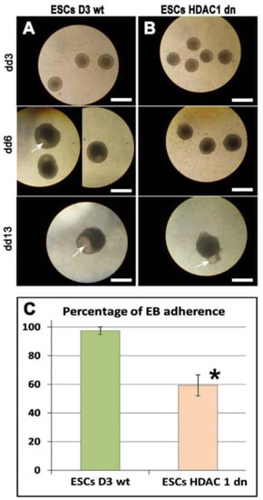 Studies on EB formation and adherence in HDAC1 wt and HDAC1 dn mESCs. Under transmitted light microscopy and through the use of bright-field microscopy, the formation of EBs was inspected at day 3 (dd3), 6 (dd6), and 13 (dd13) in (A) HDAC1 wt mESCs and (B) HDAC1 dn mESCs. Cavity formation in EBs is shown by white arrows. Scale bars show 500 µm. Adherence of EBs was reduced in HDAC1 dn mESCs as shown in panel (C). The asterisk shows a statistically significant difference at p ≤ 0.05 (*).
