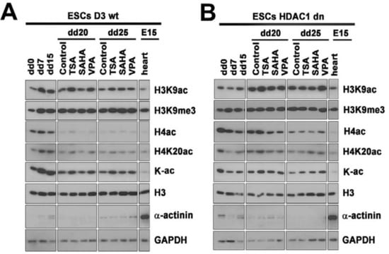 It is well-known that the differentiation of ESCs into cardiomyocytes is regulated by the specific subset of genes that are furthermore regulated by epigenetic factors, including HATs and HDACs [,]. The present study shows that HDAC1 depletion, to some extent, prevents total H4 deacetylation, which is an epigenetic marker of cardiomyogenesis (Figure 3A,B). Conversely, H3K9ac was relatively stable in differentiated wt mESCs, while HDAC1 dn mESCs that were induced to cardiac differentiation were characterized by a pronounced increase in H3K9ac (Figure 3B). In parallel, the H3K9me3 level began to be elevated in both tested mES cell lines from dd7 of cardiac differentiation, and then the level of this histone mark remained stable. Interestingly, differentiated cardiomyocytes from both wt and HDAC1 dn cells were characterized by a lower level of α-actinin in comparison to e15 embryonic hearts (Figure 3A,B). In detail, in wt mESCs, α-actinin was detectable at dd25 of cardiac differentiation, while in differentiated HDAC1 dn mESCs, the Western blot fragment showing α-actinin was visible at dd20 of differentiation and was even visible in the cells treated by HDACi (Figure 3A,B). VPA treatment increased the level of α-actinin at dd25 in wt cells, but TSA and SAHA in HDAC1 dn cells elevated the α-actinin level earlier, at dd20 (Figure 3(Cc)).