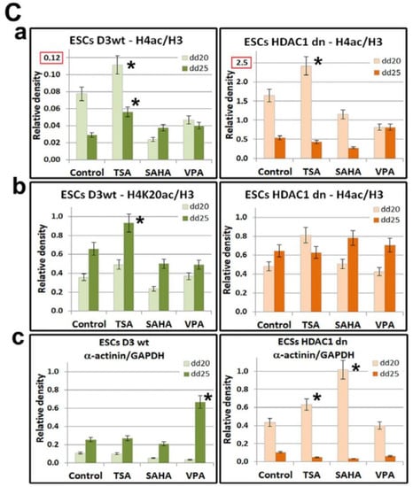 Here, we also show the results of the effect of HDACi on levels of H4ac, H4K20ac, and α-actinin (Figure 3(Ca–c)). We observed that, as opposed to SAHA and VPA, trichostatin A induced H4 and H4K20 hyperacetylation in wt cells on day 20 or 25 of cardiac differentiation, and in HDAC1 dn cells, this was observed on the 20th day of differentiation (Figure 3(Ca,b)). We found a significant increase in wt mESCs treated by TSA and when observed on day 25 (dd25) of differentiation (Figure 3(Cb)). Moreover, the α-actinin level, which is a marker of cardiomyogenesis, was elevated in the VPA-treated and differentiated wt cells (dd25), and the increased level of α-actinin was significant in the HDAC1 dn cells treated by TSA or SAHA on the 20th day (dd20) of cardiac differentiation (Figure 3(Cc)).