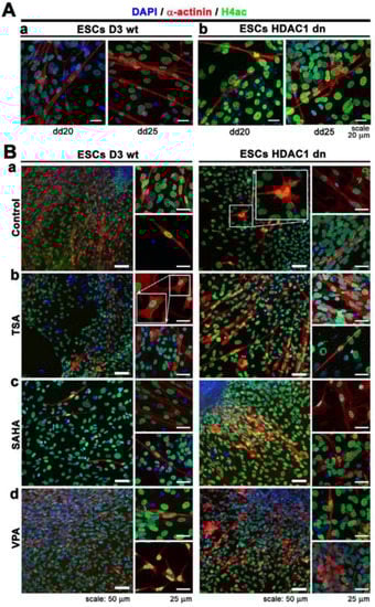 Distribution pattern and levels of histone H4 acetylation (green) and α-actinin (red) in (Aa) wt mESCs and (Ab) HDAC1 dn mESCs differentiated at dd20 and dd25. Panel (Ba) shows non-treated wt mESCs and HDCA1 dn mESCs at dd25, and panels (Bb–d) show wt mESCs and HDCA1 dn mESCs treated by HDACi at dd25: (Bb) TSA treatment, (Bc) SAHA treatment, and (Bd) VPA treatment. DAPI (blue) was used as a counterstain of the cell nuclei.