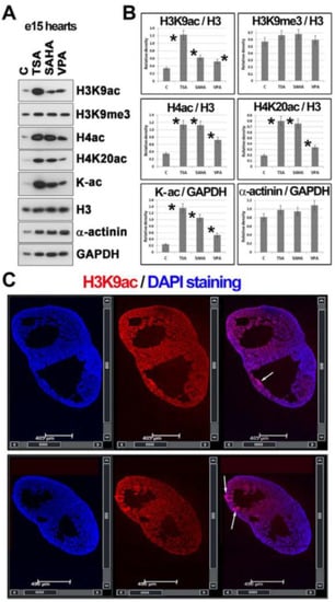 Histone post-translational modifications studied in mouse embryonic hearts (e15) treated with HDACi. (A) Western blots showed changes in H3K9ac, H3K9me3, H4ac, H4K20ac, pan-acetylated lysines (K-ac), and α-actinin in e15 embryonic hearts treated with HDACi (TSA, SAHA, and VPA). Data on histone levels were normalized to the level of histone H3 and non-histone proteins were normalized to the level of GAPDH. An identical protein amount for each experimental event was loaded on the gel. (B) Data from panel (A) were normalized to the relevant reference protein GAPDH, and the density of Western blot fragments was statistically analyzed using Student’s t-test; asterisks show statistically significant differences at p ≤ 0.05. GAPDH was used for data normalization, and α-actinin was used as a marker of cardiomyocytes. (C) The distribution pattern of H3K9ac (red) in the e15 mouse embryonic hearts is shown. DAPI (blue) was used as a counterstain of the cell nuclei. Arrows show the accumulation of H3K9ac in ventricular portions.