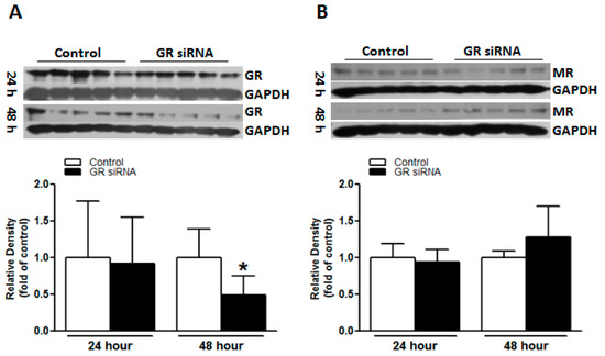 GR siRNAs (100 pmol) were administered via i.c.v. injection, and GR protein expression in the brain was determined 48 h after the treatment. As demonstrated in Figure 1A, GR siRNA treatment significantly down-regulated GR protein abundance in the mouse brain at 48 h after injection, whilst no marked effects at 24 h. Given the potentially complex balance effect of GR and MR in the brain [8,9,10,11,12], we also investigated the possible effects of GR down-regulation on the expression level of MR. Western blotting indicated that MR protein abundance in the brain was not significantly altered by the GR siRNA treatment (Figure 1B).