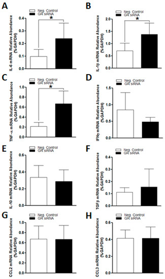 Given the pivotal role of GR in the modulation of inflammatory responses, we examined the expression profiles of key inflammation-related genes in the mouse brain via RT-qPCR. As shown in Figure 2, the GR knockdown by GR siRNAs markedly increased expression levels of pro-inflammatory cytokines, including IL-6, IL-1β, and TNF-α (Figure 2A–C), suggesting a potential role of endogenous glucocorticoids activating the GR and repressing pro-inflammatory response in the mouse brain. Of interest, GR knockdown did not exert effects on expression levels of anti-inflammatory genes—IL-10 and TGF-β (Figure 2E,F)—and inflammatory chemokines—CCL2 and CCL3 (Figure 2G,H).