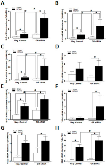 The GR repression induced heightened inflammatory responses in mice brains following MCAO. The mice received either GR siRNA (100 pmol) or its negative control (Neg. Control; 100 pmol) via intracerebroventricular (i.c.v.) injection. A middle cerebral artery occlusion (MCAO) was performed 48 h after i.c.v. injection. Sham animals were subjected to left internal carotid artery exposure but without suture insertion. The brain samples were collected at 12 h after MCAO induction. A quantitative reverse transcription polymerase chain reaction (RT-qPCR) was utilized to assess inflammation-related genes expression profiles, including IL-6 (A), LI-1β (B), TNF-α (C), IFN-γ (D), IL-10 (E), TGF-β (F), CCL2 (G) and CCL3 (H), respectively. n = 5. * p < 0.05, MCAO vs. sham; # p < 0.05, GR siRNA vs. Neg. Control.