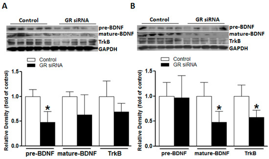 The neurotrophic effect of BDNF/TrkB signaling is well recognized in a diverse brain physiology and pathology [13,14,15]. We explored a potential role of GR repression in the regulation of BDNF/TrkB signaling in adult mouse brains. We found that the GR repression with GR siRNA treatment significantly decreased the TrkB and mature-BDNF protein abundance in the brain (Figure 4B), suggesting a potential interaction between the GR and BDNF/TrkB signaling in adult mouse brains. GR siRNA treatment also induced a transient decrease of the pre-BDNF level at 24 h, which was restored at 48 h (Figure 4A,B).