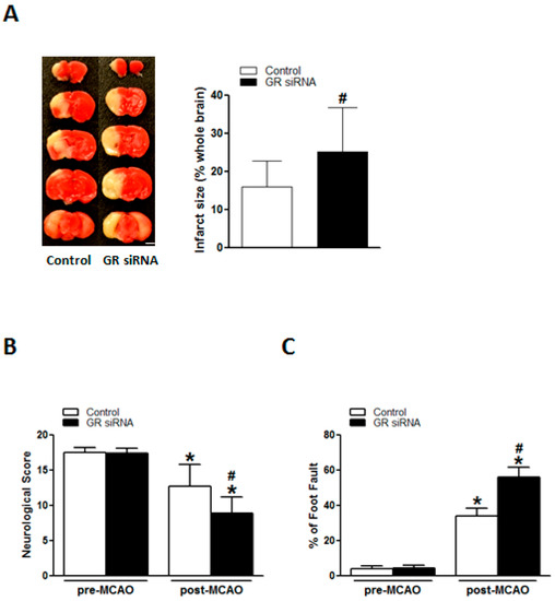 The GR repression increased the infarction size and worsened neurobehavioral deficits in mice with MCAO. The mice received either GR siRNA (100 pmol) or its negative control (Neg. Control; 100 pmol) via intracerebroventricular (i.c.v.) injection. A middle cerebral artery occlusion (MCAO) was performed 48 h after i.c.v. injection. The brain infarction size was assessed 48 h after MCAO conduction (A). Neurobehavioral tests including Neurological Score (B) and Foot Fault (C) were evaluated before MCAO conduction and 48 h after MCAO conduction, respectively. n = 10–12. * p < 0.05, pre-MCAO vs. post-MCAO; # p < 0.05, GR siRNA vs. Control. Scale bar, 2 mm.