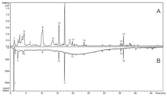 Total ion chromatogram in the negative ion mode (A) and chromatogram at wavelengths of 270-330 nm (B) of S. adstringens aqueous extract (SAAE).