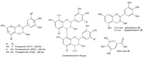 Structures of flavan-3-ol monomers composed the proanthocyanidins from S. adstringens aqueous extract (SAAE), a typical condensed tannin B-type and some chemical compounds that were identified.