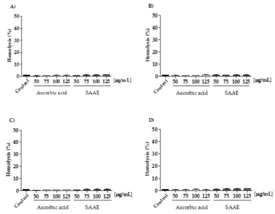 Assessment of hemolysis in human erythrocytes incubated for (A) 60, (B) 120, (C) 180 and (D) 240 min with different concentrations of ascorbic acid and the SAAE (50–125 μg/mL). Data are expressed as the mean ± SEM (n = 3) in duplicates.