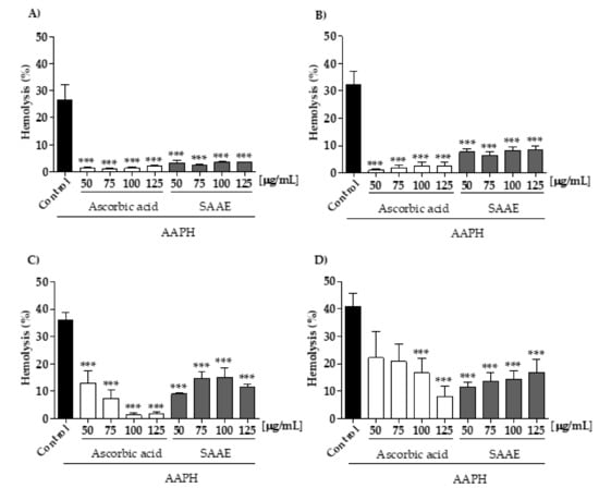 Assessment of hemolysis in human erythrocytes incubated for (A) 60, (B) 120, (C) 180 and (D) 240 min with the oxidizing agent AAPH with different concentrations of ascorbic acid and the SAAE (50–125 μg/mL). Data are expressed as the mean ± SEM (n = 3) in duplicates. *** p < 0.0001, compared with the control group AAPH.