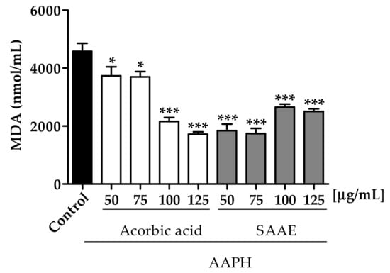 Malondialdehyde (MDA) concentration after adding the oxidizing agent AAPH to erythrocytes incubated for 240 min with different concentrations (50–125 μg/mL) of ascorbic acid and the SAAE. Data are expressed as the mean ± SEM (n = 3) in duplicate. * p < 0.05 and *** p < 0.0001 compared with the control group AAPH.
