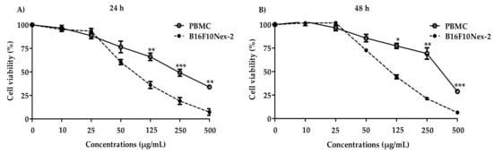 Viability curve in PBMC and B16F10Nex-2 cells. Cells were treated with different concentrations of the SAAE for (A) 24 h or (B) 48 h. Data are expressed as the mean ± SEM (n = 3) in triplicates. * p < 0.05, ** p < 0.01, and *** p < 0.0001 compared with B16F10Nex-2 cells.
