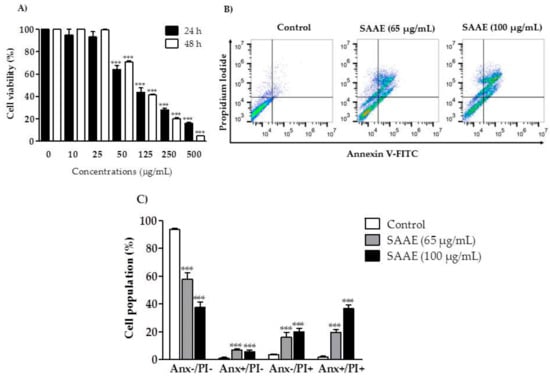 Viability and cell death profiles of the B16F10Nex-2 melanoma cell line after treatment with different concentrations of the SAAE. (A) Cell viability versus concentration (10–500 µg/mL) after 24 and 48 h of treatment. (B) Diagram of flow cytometry of cells stained with Annexin V–fluorescein isothiocyanate (FITC) and propidium iodide (PI) after a 24 h of treatment with the SAAE (65 and 100 µg/mL). The lower left quadrant (Anx−/PI−) represents viable cells, the lower right quadrant (Anx+/PI−) represents apoptotic cells, the upper left quadrant (Anx−/PI+) represents necrotic cells, and the upper right quadrant (Anx+/PI+) represents late apoptotic cells. (C) Percentage of dead cells assessed in the diagram corresponding to concentrations of 65 and 100 µg/mL. Data are expressed as the mean ± SEM (n = 3) in duplicates. *** p < 0.0001, compared with the untreated control group.