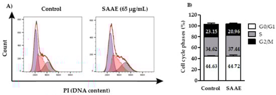 The histogram shows the distribution of the cell cycle phases of control (untreated) and treated (65 µg/mL SAAE for 24 h) B16F10Nex-2 cells (Figure 8A). No significant differences were observed between cells from the control and SAAE treatment group, thus showing that treatment with the SAAE had no effect on the distribution of cell cycle phases of this cell line (Figure 8B)