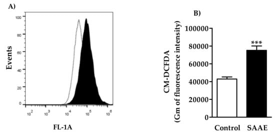 Cells treated with the SAAE (65 µg/mL) had increased ROS levels, as shown by the right-shifted fluorescence levels in the histogram (Figure 9A). The ROS levels increased by approximately 75% in B16F10Nex-2 cells treated with the SAAE in comparison to untreated cells (Figure 9B).