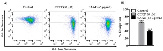 (A) Density Plot and (B) graphical representation of the percentages of mitochondrial membrane potential change in the control, CCCP-treated (30 μM) and SAAE-treated (65 μg/mL) B16F10Nex-2 melanoma cells. Data are expressed as the mean ± SEM (n = 3) in duplicates. *** p < 0.0001 compared with the untreated control group.