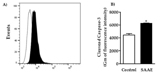 The assessment of the effects of the SAAE on caspase-3 in B16F10Nex-2 cells showed a right shift in the fluorescence levels in the histogram (Figure 11A), with an approximately 40% increase in the cleaved caspase-3 labeling intensity compared with untreated control cells (Figure 11B).