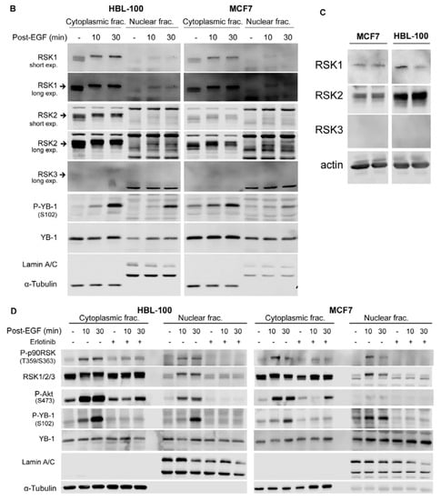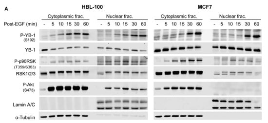 2.2. Phosphorylation of Nuclear YB-1 after Stimulation with EGF Is Associated with Nuclear Accumulation of RSK but Not of YB-1