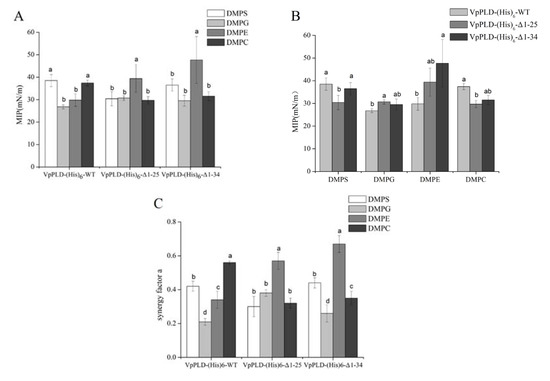 It was nevertheless interesting to compare the MIP and synergy factor values. As mentioned above, no significant difference could be seen between the MIP of VpPLD-(His)6-Δ1-25 and that of VpPLD-(His)6-Δ1-34 in the presence of DMPE (Figure 5B), which was clearly supported by the synergy data (Figure 5C) (p < 0.05), with synergy values of 0.57 ± 0.05 and 0.67 ± 0.05, respectively. The small difference between the MIP of VpPLD-(His)6-WT and that of VpPLD-(His)6-Δ1-34 in the presence of DMPS, DMPG, and DMPC (Figure 5B) was also convincingly supported by the synergy data (p > 0.05) (Figure 5C). Similarly, the significant change between the MIP of VpPLD-(His)6-WT and that of VpPLD-(His)6-Δ1-25 in the presence of DMPS, DMPG, and DMPC (Figure 5B) was convincingly supported by the synergy data a (p < 0.05) (Figure 5C).