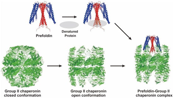 Prefoldin (PFD) is a cochaperone of group II chaperonin. PFD, originally discovered when screening yeast genes, is involved in microtubule formation and acts in an actin-folding complex [,], and is also found in archaea. Archaeal PFDs are hexamers composed of two types of subunits: Two α subunits and four β subunits. Archaeal PFDs are molecular chaperones capable of stabilizing a range of nonnative proteins, and releasing them for subsequent group II chaperonin-assisted folding [,,]. Eukaryotic PFD interacts specifically and transfers substrates to a eukaryotic group II chaperonin (chaperonin containing TCP-1 (CCT); also called TCP-1 ring complex (TRiC)). Eukaryotic PFDs are composed of six different subunits: two α-like subunits (PFD3 and PFD5) and four β-like subunits (PFD1, PFD2, PFD4, and PFD6).