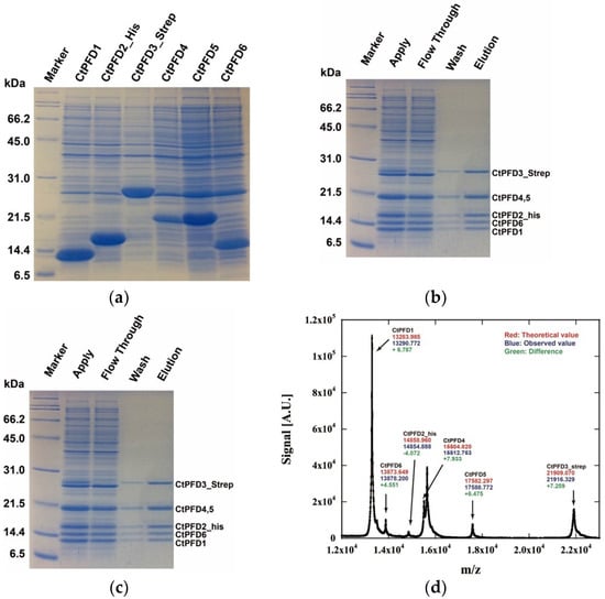 Each CtPFD subunit was expressed in E. coli independently. To obtain the reconstituted hexameric complex by affinity chromatography, a Strep-tag sequence was attached at the C-terminus of PFD3, and the His-tag sequence was attached at the N-terminus of PFD2. All six subunits were highly expressed in E. coli (Figure 2a). All purified PFD subunit proteins were denatured with a buffer containing 6 M urea, then mixed in equimolar amounts. Refolding and reconstitution were performed through dilution of urea concentration by dialysis. The reconstituted CtPFD complex was purified by two-step affinity chromatography using the Strep-tag and His-tag (Figure 2b,c). Finally, the CtPFD complex was purified by size-exclusion chromatography. analysis showed five protein bands. One of these corresponded to PFD4 and PFD5. The existence of the six subunits was also confirmed by MALDI-TOF mass spectrometry (Figure 2d).