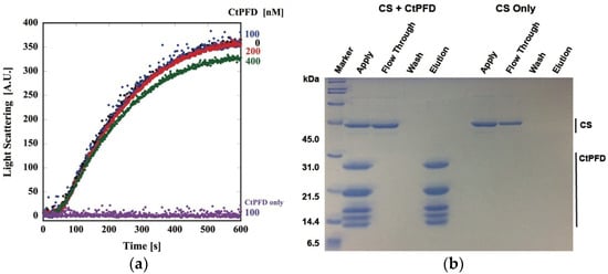 First, we examined the chaperone activity of CtPFD using unfolded porcine heart citrate synthase (CS) as a nonspecific substrate, as it has been used for archaeal PFD []. Thermal aggregation of CS was observed as the increase of light scattering. In contrast, CtPFD did not exhibit any increase of light scattering. Despite the addition of excess CtPFD, CS aggregation was not suppressed (Figure 4a). The interaction between CtPFD and CS was analyzed by a pull-down assay. CS did not coelute with CtPFD (Figure 4b). Therefore, we concluded that CtPFD does not have general chaperone activity.