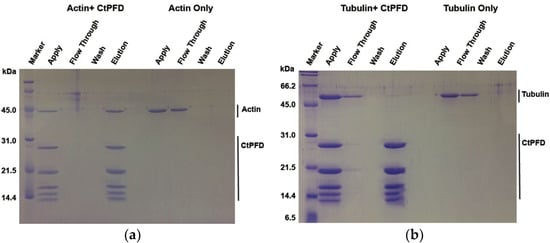 The binding affinities of CtPFD to actin and tubulin were assessed by the pull-down assay. CtPFD was immobilized on a Strep-Tactin column, and acid-denatured actin and tubulin were applied to it. After several washes, CtPFD was eluted by adding 2.5 mM d-desthiobiotin, and the eluted proteins were detected with Coomassie Brilliant Blue-stained SDS-PAGE and by western blots (Figure 5a,b). The results clearly showed that CtPFD bound to denatured actin and tubulin.