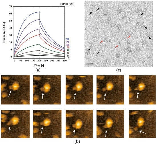 The interaction between CtPFD and CCT from C. thermophilum (CtCCT) was analyzed by surface plasmon resonance (SPR) using the Biacore T200. When CtPFD was immobilized on the sensor chip by amine coupling, CtCCT produced a concentration-dependent signal (1, 2, 5, 10, 15, 20, 30, 40, 50, 75, 100, 150, 200 nM). Sensorgrams for CtCCT concentrations of 5, 10, 20, 40, 75, 100,150, and 200 nM are shown (Figure 6a). The kinetic parameters kon, koff, and KD were calculated to be 9.02 × 104, 4.03 × 10−3, and 4.47 × 10−8, respectively. The KD value is similar to that of archaeal counterparts []. Although the KD value is small, the dissociation rate is high. Thus, the CtPFD–CtCCT complex seems to be unstable. This was confirmed in real time in experiments with high-speed atomic force microscopy (HS-AFM). When CtCCT was immobilized on a mica surface and CtPFD was added, we observed CtPFD–CtCCT complex formation (Figure 6b), and the unstable nature of the CtPFD–CtCCT interaction could be confirmed by electron microscopy, which revealed a low percentage of CtPFD–CtCCT complexes, despite the incubation of CCT and PFD oligomers at a 1:5 ratio (Figure 6c).