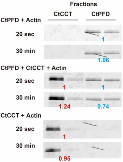 Actin transfer from CtPFD to CtCCT. Fluorescence images of fluorescent actin binding to CtPFD (top), to CtPFD and subsequently to CtCCT (middle) and to CtCCT (bottom). Each band corresponds to different fractions of the experiments. Relative intensities are shown.