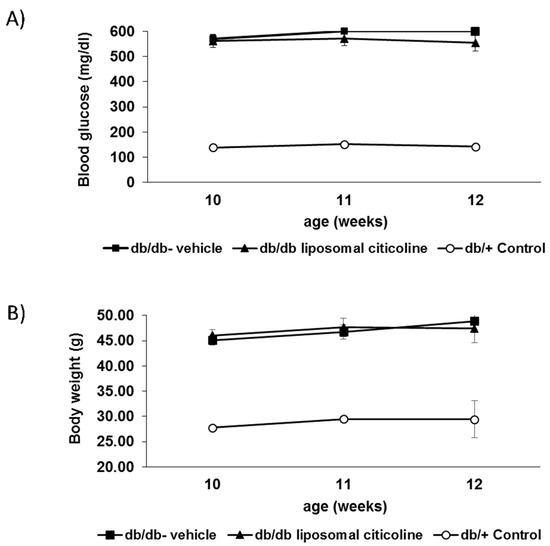 We did not find any difference in blood glucose concentrations and body weight during the study between db/db mice treated with topical administration of citicoline and db/db mice treated with vehicle (Figure 1).