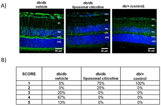 GFAP (Glial fibrillar acidic protein) expression was mainly confined to the retinal ganglion cell layer (GCL) in non-diabetic control mice (db/+) (Figure 2). By contrast, age-matched diabetic mice (db/db) treated with vehicle presented significantly higher GFAP expression. It must be noted that 100% of diabetic mice presented a GFAP score of ≥3. The administration of citicoline resulted in a significant decrease of reactive gliosis, being a GFAP score of ≤3 in all cases (Figure 2).