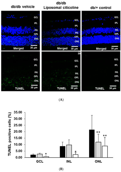 Effect of citicoline on apoptosis. (A) TUNEL (Terminal Transferase dUTP Nick-End Labeling) positive immunofluorescence (green) in a representative mouse from each group. Nuclei were labeled with Hoechst (blue). Scale bars, 30 µm; (B) percentage of TUNEL positive cells in the neuroretina. ONL: outer nuclear layer; INL: inner nuclear layer; GCL: ganglion cell layer. Black columns: db/db-vehicle; gray columns: db/db-citicoline; white columns: db/+. Results are mean ± SD. *: p < 0.05 in comparison with the other groups. **: p < 0.05 in comparison with db/db-vehicle. n = seven mice per group.