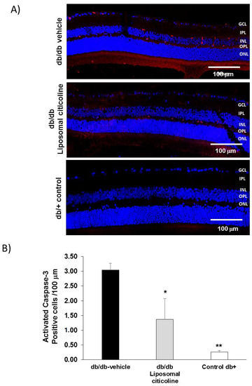 Effect of citicoline on caspase 3. (A) Activated Caspase 3 immunofluorescence (red) in a representative mouse from each group. Scale bars, 100 µm. Nuclei were labeled with Hoechst (blue). ONL: outer nuclear layer; OPL: outer plexiform layer; INL: inner nuclear layer; IPL: inner plexiform layer; GCL: ganglion cell layer; (B) quantification of activated caspase 3 immunofluorescence. Results are mean ± SD. *: p < 0.05 in comparison with the other groups. **: p < 0.05 in comparison with the other groups. n = seven mice per group.