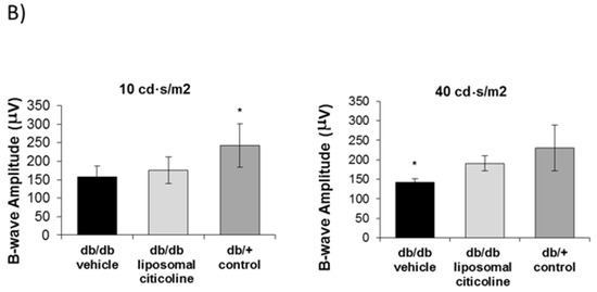Effect of citicoline on electroretinography (ERG)abnormalities. (A) ERG traces in response to low (10 cd·s/m2) and medium (40 cd·s/m2) stimulus intensities in a representative mouse of each investigational group. Red line: db/db-vehicle. Black line: db/db-citicoline. Green line: db/+ (non-diabetic control); (B) quantitative analyses of amplitude of b-wave in db/db treated with vehicle, db/db treated with citicoline, and non-diabetic mice. Results are mean ± SD. * p < 0.05 in comparison with the other groups.