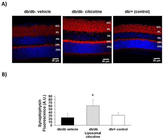 Effect of citicoline on synaptophysin. (A) Comparison of synaptophysin immunofluorescence (red) between representative samples from a db/db mouse treated with vehicle, a db/db mouse treated with citicoline, and a non-diabetic mouse. Nuclei were labeled with Hoechst (blue). ONL: outer nuclear layer; OPL: outer plexiform layer; INL: inner nuclear layer; IPL: inner plexiform layer; GCL: ganglion cell layer; (B) Quantification of synaptophysin immunofluorescence in arbitrary units (AU). Results are mean ± SD. * p < 0.01 vs. the other groups.