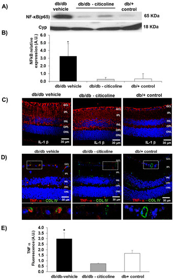 (A) Western blot analysis of NF-κB in a representative mouse from each group; (B) Quantification of western blot analysis. AU: arbitrary units. Data are expressed as mean ± SD; (C) IL-1β immunofluorescence (red) in a representative mouse from each group. Nuclei were labeled with Hoechst (blue); (D) double immunostaining for collagen IV (green), and TNF-α (red) from a representative case of a db/db mouse treated with vehicle, a db/db mouse treated with citicoline, and a non-diabetic (db/+) mouse. ONL: outer nuclear layer; OPL: outer plexiform layer; INL: inner nuclear layer; IPL: inner plexiform layer; GCL: ganglion cell layer. The dotted boxes are magnified in the bottom of panel; (E) quantification of TNF-α total fluorescence. n = seven mice per group. * p < 0.01 vs. the other groups.