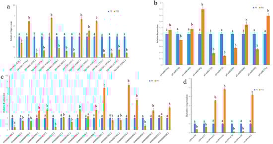 Quantitative Real-Time PCR (qRT-PCR) analysis. (a) Relative expression levels of miRNAs; U6 snRNA was used as the endogenous reference gene. (b) Relative expression levels of lncRNAs; 18S rRNA was used as the endogenous reference gene. (c) Relative expression levels of mRNAs. (d) Relative expression levels of circRNAs; 18S rRNA was used as the endogenous reference gene. The standard error of the mean for three replicates is represented by the error bars. Samples marked with various letters show a significant difference at p < 0.05.