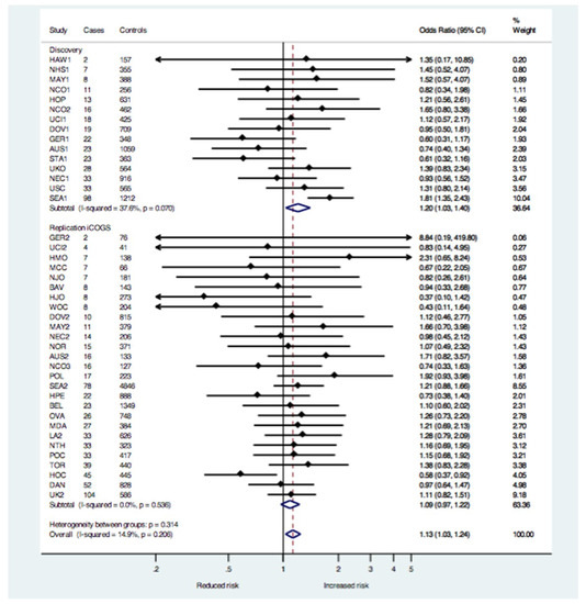 Forest plot of the study-specific (filled diamonds) and pooled (open diamonds) odds ratios and 95% confidence intervals (solid horizontal lines) for the association between rs495139 and risk of MOC under the ordinal genetic risk model in the discovery and iCOGs samples. The total sample size in the meta-analysis is 1019 MOC cases and 23,666 controls of European ancestry. Dashed vertical line represents overall summary estimate–odds ratio. Individual study estimates are adjusted for ancestry and pooled estimates are adjusted for ancestry and study. See Table 1 footnote for details regarding sample size.
