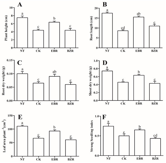 Effect of EBR application and low-temperature stress on cucumber seedling growth ((A) plant height, (B) root length, (C) root dry weight, (D) shoot dry weight, (E) leaf area) and (F) the strong seedling index. Different letters indicate significant differences at p < 0.05.