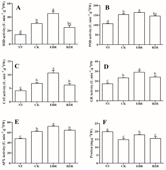 The antioxidant enzyme activity (SOD, POD, GR, CAT and APX) levels were significantly increased in EBR, as compared to the NT, CK and BZR treatments, as measured 7 days after exposure to low-temperature stress, as presented in Figure 2. The antioxidant enzymes activity levels were the same in BZR and CK, but significantly higher than NT. Exogenous EBR increased SOD, POD, GR, CAT, and APX activity by 116.18%, 38.68%, 62.23%, 148.61% and 48.40%, and the CK treatment enhanced their activity by 45.20%, 29.46%, 30.55%, 58.43% and 27.29%, respectively, all as compared to NT. The BZR and CK treatments did not differ detectably from each other, but in both, activity was enhanced significantly as compared with NT. The antioxidant enzyme activity was significantly lower in NT, but this treatment enhanced protein content over that of the low-temperature stress treatments (CK, EBR, and BZR). EBR may regulate the plant defense system to reduce the adverse effect of low-temperature stress.