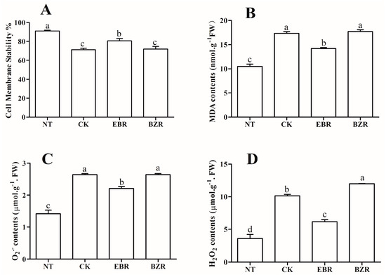 Effects of EBR on (A) Cell membrane stability %, (B) MDA, (C) O2·−, and (D) H2O2 in cucumber seedlings under low temperature stress. Different letters indicate significant differences at p < 0.05.