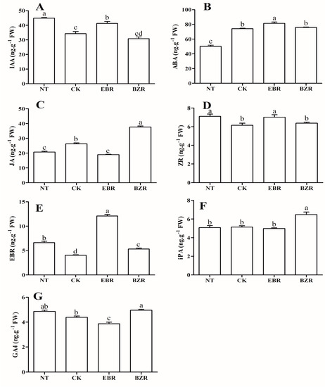 Exogenous EBR applications significantly increased the plant hormone content in leaves of cucumber seedlings exposed to low-temperature stress (Figure 4). Low-temperature stress reduced the leaf IAA content, as compared to the NT and EBR treatments (Figure 4A). Additionally, the IAA content increased by 20.49% in the EBR treatment but decreased by 10.01% in the BZR treatment, and by 30.92% in NT treatment, when compared with the CK treatment. Low temperature significantly reduced the ABA content, but it was enhanced by exogenous EBR application. The ABA contents were increased by 9.72% and 7.33% in the EBR treatment, as compared to CK and BZR treatments, respectively, whereas the NT treatment resulted in the lowest ABA contents (Figure 4B). The EBR content increased in the EBR treatment by 200% and 126.91% compared with the CK and BZR treatments, respectively. Endogenous EBR contents increased under NT at 64.64% and 24.55%, as compared to CK and BZR, respectively, but decreased by 82.21% as compared to EBR (Figure 4E). The ZR content also significantly increased in the EBR and NT treatments, but decreased with the CK and BZR treatments (Figure 4D). Low-temperature stress (CK) increased the JA (27.91%) content in leaves of cucumber seedlings, BZR treatment increased the JA content (49.58%), and NT also increased JA (9.33%), compared with the EBR treatment (Figure 4C). EBR significantly negatively affected GA4 accumulations, which increased by 11.77% in the CK treatment, with the BZR treatment increased the GA4 content 21.91% beyond that of the CK treatment, while NT and BZR did not differ detectably (Figure 4G). In addition, the iPA content was statistically equivalent after the EBR, CK, and NT treatments as well, but it increased 23.07% after the BZR treatment (Figure 4F).