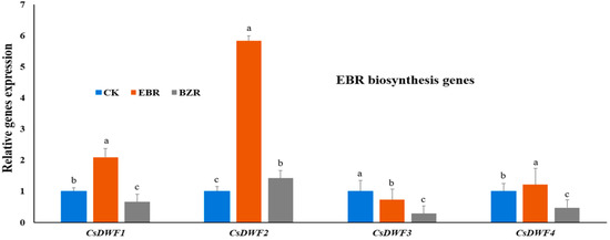 DWFs are key EBR biosynthesis genes in plants [9,10,13]. Expression levels were investigated in cucumber seedlings exposed to low-temperature stress (Figure 5). Exogenous EBR significantly increased the expression levels of EBR biosynthesis-related genes CsDWF1, CsDWF2, and CsDWF4, but CsDWF3 was downregulated. Low-temperature stress substantially reduced the expression levels of CsDWF1, CsDWF2, and CsDWF4, but up-regulated CsDWF3 gene expression level, as compared to EBR. Additionally, BZR-treated seedlings down-regulated CsDWF1, CsDWF3, CsDWF4 genes expression levels, but up-regulate CsDWF2, as compared to CK. The expression level of CsDWF3 gene was down-regulated by exogenous EBR and BZR application, but significantly up-regulated in CK. The down-regulated CsDWF genes allowed for significant incremental increases in defense-related enzyme activities, which resulted in increased plant growth (both fresh and dry weight) under low-temperature stress, suggesting that EBR induced low-temperature stress tolerance.