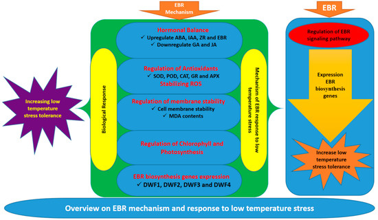 The results of the present study suggest that low-temperature stress caused oxidative stress by overproduction of ROS and MDA, and decreased antioxidant enzyme activity which would otherwise damage membrane stability, reduce chlorophyll, and limit photosynthetic capacity, all of which result a significant reduction in cucumber seedling growth. Application of exogenous EBR alleviated this inhibition by improving the chlorophyll content and photosynthetic capacity levels, thus enhancing tolerance to low-temperature stress. In addition, exogenous EBR played a role in regulation of the accumulation of phytohormones, which may have a positive effect on the capability of a plant to enhance tolerance to low-temperature stress. As presented in Figure 6, endogenous hormonal balance by EBR may signal antioxidant enzymes that reduce the overproduction of ROS and lead to protection of chlorophyll and the photosynthetic machinery under low-temperature stress. Although the mechanism of EBR and phytohormones regulation has not been fully elucidated under low-temperature stress, this study has given new insights into plant resistance to low-temperature stress through EBR application and interactions with endogenous plant hormones.