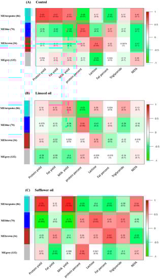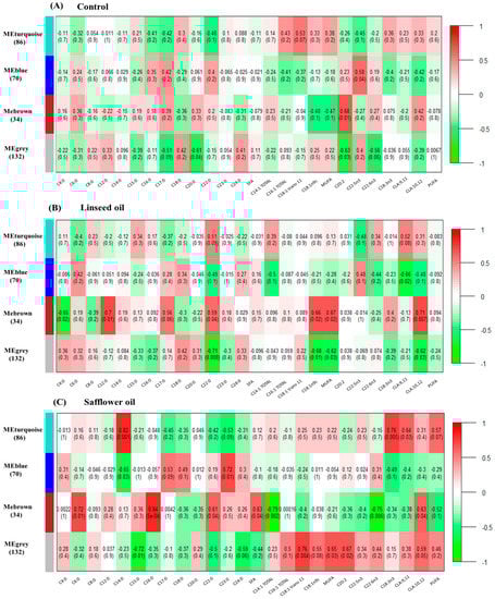 Consensus module−trait relationship matrix: The weighted gene co-expression network analysis (WGCNA) was used to group miRNAs into consensus modules based on their expression patterns. Four consensus modules were identified and each consensus module eigengene was tested for correlation with milk fatty acid traits during (A) control period, (B) linseed oil and (C) safflower oil treatments. Correlation coefficients and corresponding p-values (in brackets) between miRNA modules in the y-axis and milk fatty acids in the x-axis. The module−trait relationship matrix is colored based on the intensity of the correlation: red is a strong positive correlation, while green is a strong negative correlation.