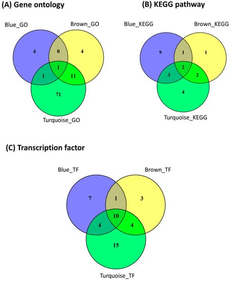 Venn diagrams showing number of enriched unique and shared (A) gene ontology terms, (B) Kyoto encyclopedia of genes and genomes (KEGG) pathways and (C) transcription factors for predicted target genes of miRNA in the blue, brown, and turquoise modules. GO: Gene ontology, KEGG; KEGG pathway, TF: Transcription factor.