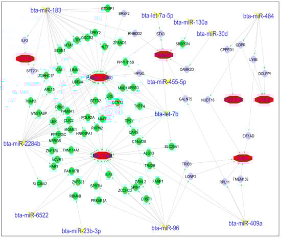 A total of 132 of 1311 filtered target mRNAs, 19 of 1533 filtered target mRNAs and 2 of 1697 filtered target mRNAs were negatively and significantly correlated with miRNAs in the blue, brown, and turquoise modules, respectively (Table S1g). The most significantly correlated miRNA–mRNA pairs were bta-miR-183/RHBDD2 (p = 0.003), bta-miR-484/ADM2 (p = 0.001) and bta-miR-130a/SBSPON (p = 0.004) in the blue, brown, and turquoise modules, respectively. Moreover, 68, 6 and 2 miRNA–mRNA pairs were found to be significantly correlated with at least one phenotype at FDR < 0.05 (Table 6, Figure 4). Milk yield, protein yield, and protein percentage were correlated (FDR < 0.05) with 28, 31 and 5 miRNA–mRNA pairs, respectively (Table 6, Figure 4).