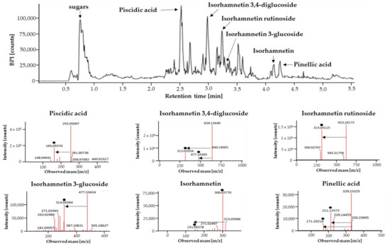 Phytochemicals in OHE were analyzed using ultra-performance liquid chromatography–quadrupole-time of flight (UPLC-Q-TOF) mass spectrometry (MS) operating in an electrospray ionization (ESI) negative mode are shown in Figure 1. A total of six compounds were tentatively identified by comparison of their retention time, precise molecular mass, and the patterns of MS fragmentations. Sugars, piscidic acid, isorhamnetin 3,4-diglucoside, and isorhamnetin rutionside were identified as the major phytochemicals in OHE. Moreover, isorhamnetin, isorhamnetin 3-glucoside, and pinellic acid were identified.
