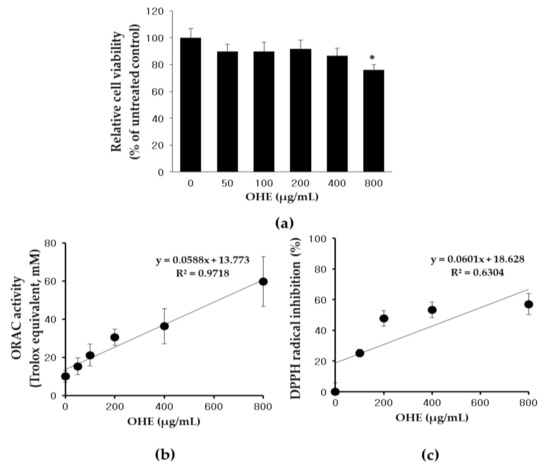 A 3-(4,5-dimethylthiazol-2-yl)-5-(3-carboxymethoxyphenyl)-2-(4-sulfophenyl)-2H tetrazolium (MTS) assay was conducted to estimate the cytotoxic effect of OHE treatment. HDFs were treated with various concentrations of OHE for 24 h. OHE showed no cytotoxic effects on HDFs up to 400 μg/mL. However, the cell viability was significantly affected by OHE at 800 μg/mL (Figure 2a). An oxygen radical absorbance capacity (ORAC) assay was then used to determine the antioxidant capacity of OHE in vitro (Figure 2b), and the results demonstrated that OHE significantly increased the antioxidant capacity in a dose-dependent manner. Furthermore, we analyzed the radical-scavenging activity of OHE using a 2,2-diphenyl-1-picrylhydrazyl (DPPH) assay. As shown in Figure 2c, OHE inhibited DPPH radicals by 53.3% at 400 μg/mL dose-dependently.