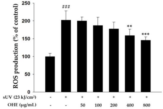 ROS generated by UV radiation promotes MMP expression, leading to the degradation of collagen and ECM proteins [8]. Therefore, inhibition of ROS production may be an effective strategy to alleviate UV-induced skin damage or photoaging. Thus, we investigated the effects of OHE treatment on sUV radiation-induced ROS generation in HDFs. As shown in Figure 3, sUV-radiated cells exhibited markedly increased ROS generation compared with non-irradiated cells, while treatment with higher concentrations of OHE (200, 400, and 800 μg/mL) significantly decreased the ROS production compared with that in sUV-radiated control cells. These results indicated that OHE may have an inhibitory effect on the production of intracellular ROS under sUV exposure.